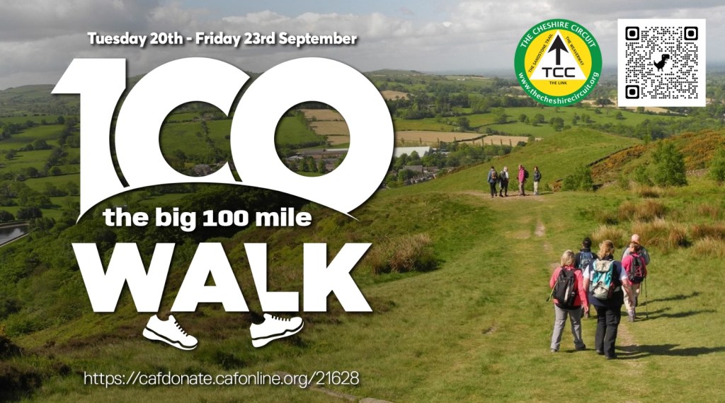 Then my Grandson said, ‘well if you are walking 88 miles, why would you not walk 100 miles?’ Hhmm yes fair point. So, I then plotted a 12-mile route from home to the closest point on the Cheshire Circuit route – Northwich, making a total distance of 100 miles. This became my ‘warm up’ and ‘pace setting’ day. I actually walked the flat, easy 12 miles in just under 4 hours. So knew I could work on 3 mph for most of the route.